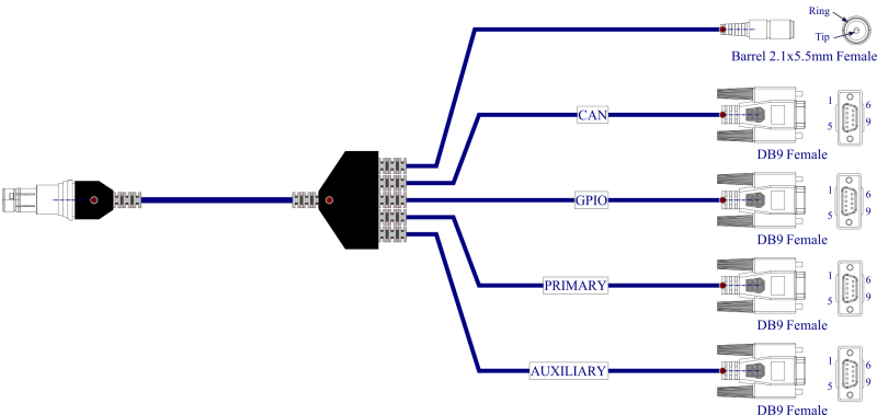 The IO breakout cable comprises of one DC barrel plug for power, and four DB9 connectors that allow connecting to: