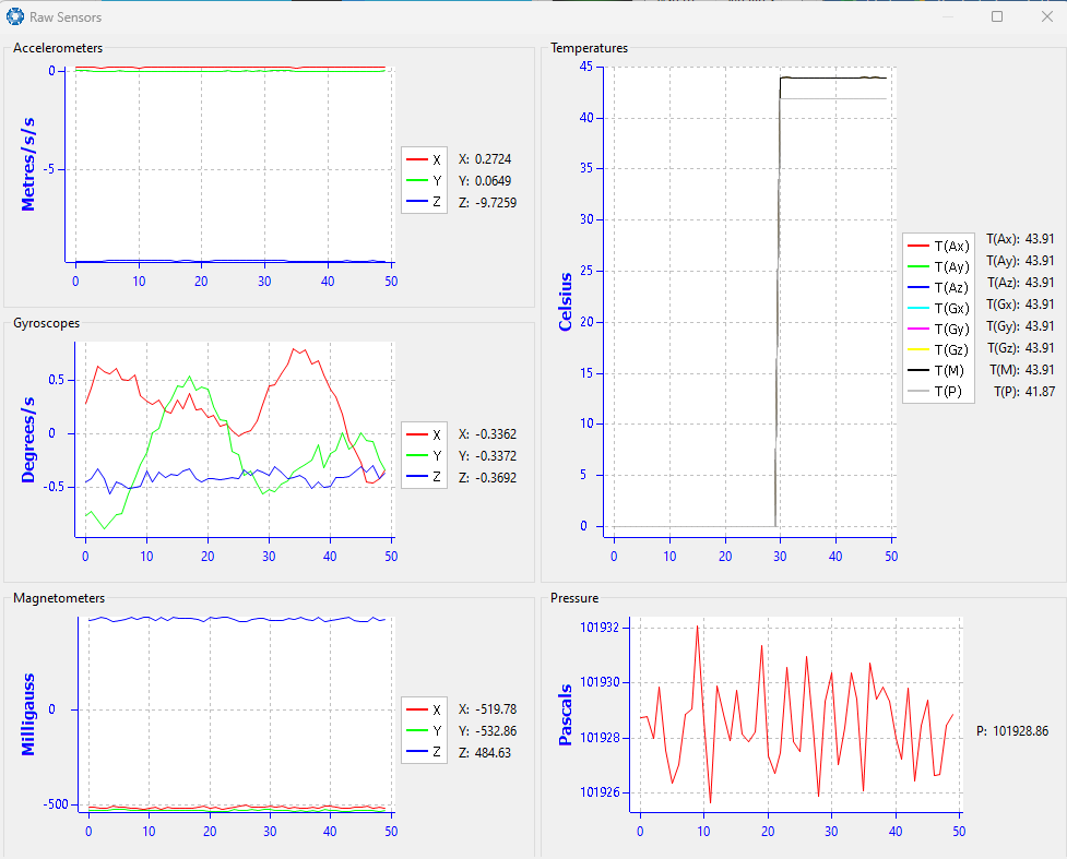 The plots include accelerometer, gyroscope, and magnetometer readings. Temperature readings are provided for a range of sensors, including T(Ax), T(Ay), T(Az) for the accelerometer axes; T(Gx), T(Gy), T(Gz) for the gyroscope axes; T(M) for the magnetometer; and T(P) for the pressure sensor.