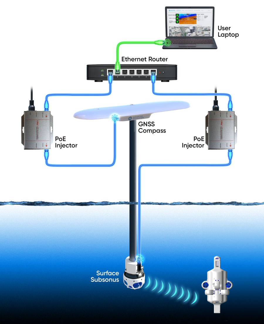 This connection diagram shows the connections required to set up position aiding for a Surface Subsonus using the Advanced Navigation GNSS Compass.