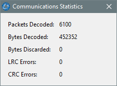 The Communications page shows statistics on the data packets received from the INS (e.g., packets decoded, bytes discarded, LRC/CRC errors and is useful for diagnosing any signal quality problems on the connection, such as signal strength or connectivity.