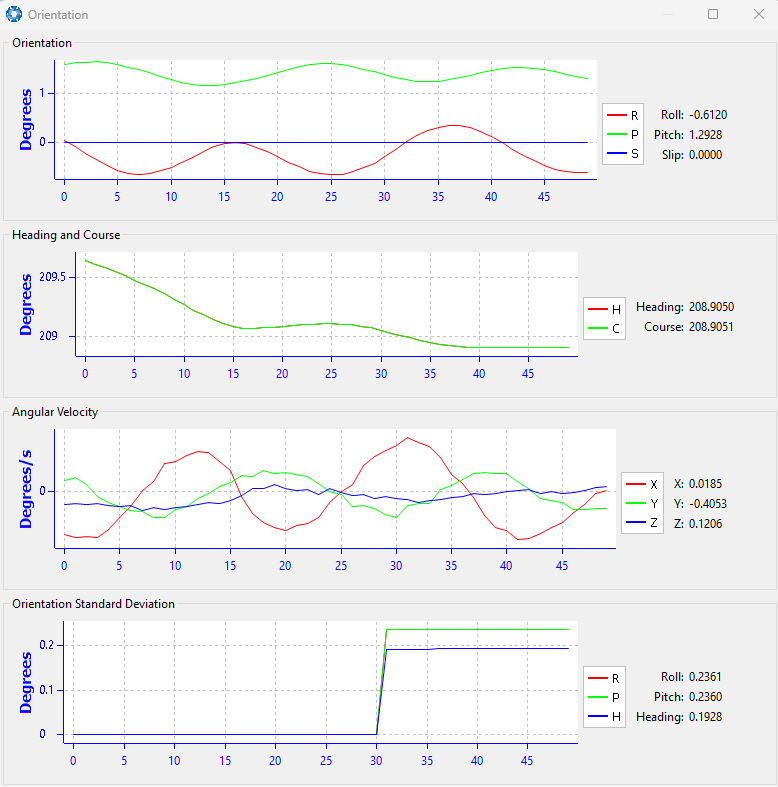 The Orientation page shows the INS orientation, angular velocity, and orientation error.
