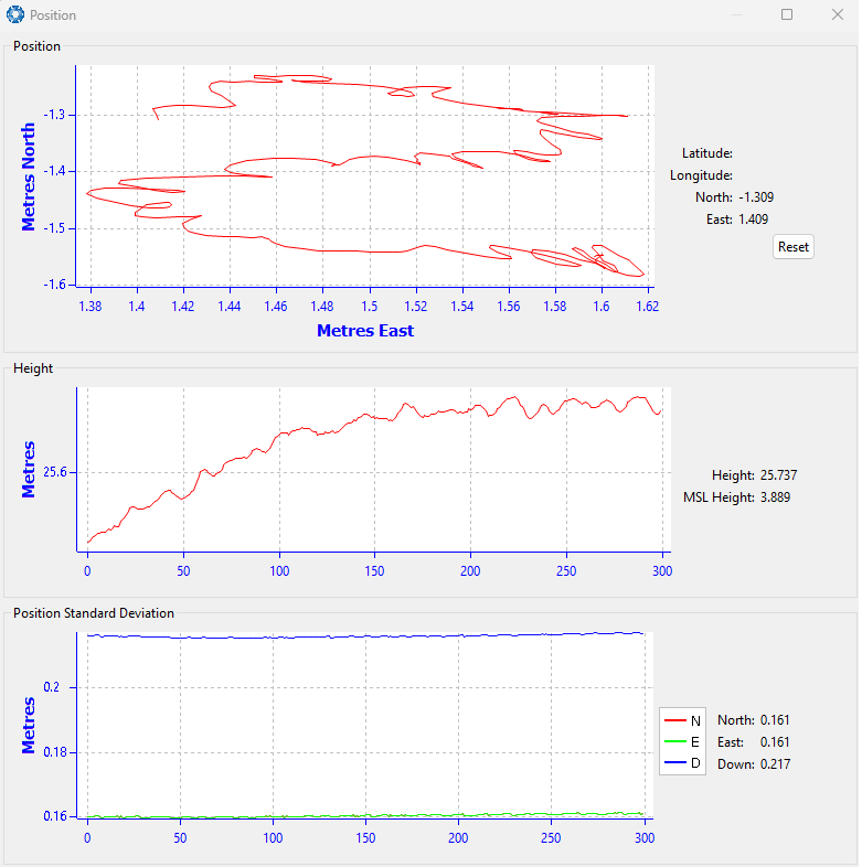 The Position page shows the INS position and position error (standard deviation). Latitude and longitude are converted to North and East metres from a reference point.