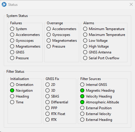 The Status dialogue shows the current system status, filter status, and GNSS status flags, as reported by System State Packet (ID#20) and Raw GNSS Packet. (ID#29)