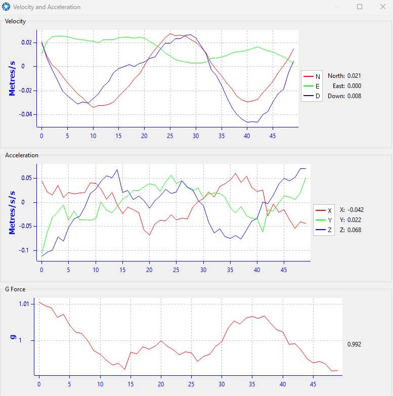 The Velocity and Acceleration page shows the INS velocity, acceleration, and g-force over time.