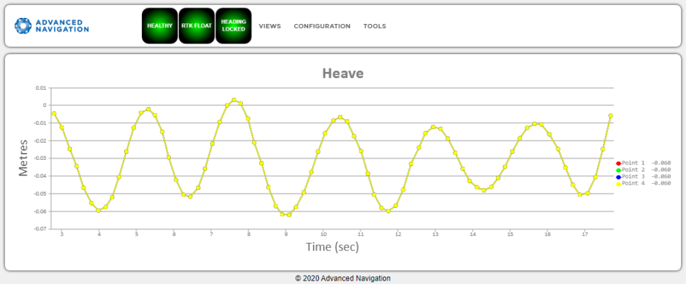 This page displays the heave at up to 4 reference points. For data to display, the Heave Packet (ID 58) is configured in the Configuration Menu dialogue. Reference point offsets are configured in the Configuration Menu dialogue.