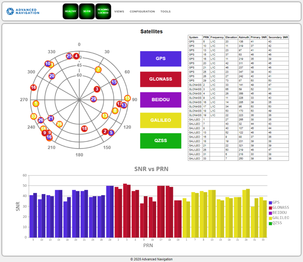 The plot shows the SNR of each satellite or each satellite at the primary and secondary antenna. As a guideline, SNRs should be within 5-10 dB of each other in the absence of cable or antenna faults. Elevation and azimuth are displayed in units of degrees.