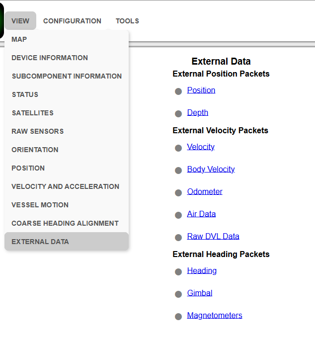 This page acts as a jump page to open time-based data graphs for each supported external source. External sources must be connected and configured appropriately for the corresponding packet to report valid data.