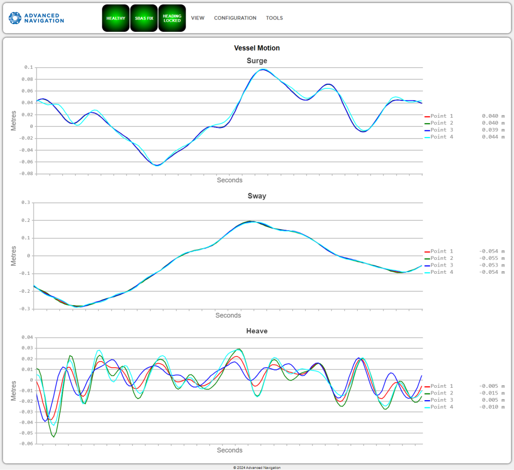 This page displays the vessel motion (heave, surge, sway) at up to 4 reference points. For data to display, the Vessel Motion Packet (ID 89) must be configured in the Configuration Menu dialogue. Reference point offsets are configured in the Configuration Menu dialogue.