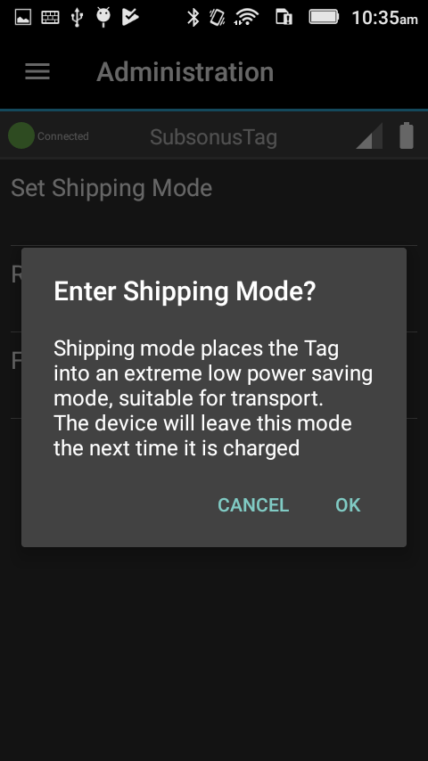 When setting Shipping mode a pop-up will be displayed asking for confirmation – see Shipping mode confirmation. Note that entering shipping mode will turn off the Tag and disconnect it from the Tag Manager application. The only way to exit shipping mode is to place the Tag on a charger.