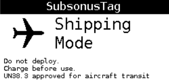When Subsonus Tag is sent to shipping mode the screen will display a fixed shipping mode logo as well as shipping information.