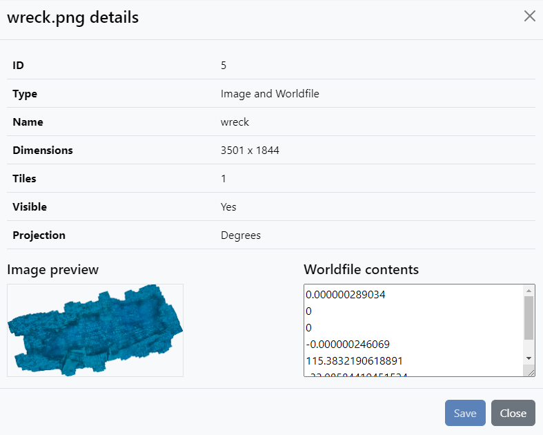For Image and Worldfiles type layers, the detail dialog offers users to edit the worldfile contents in a text field.