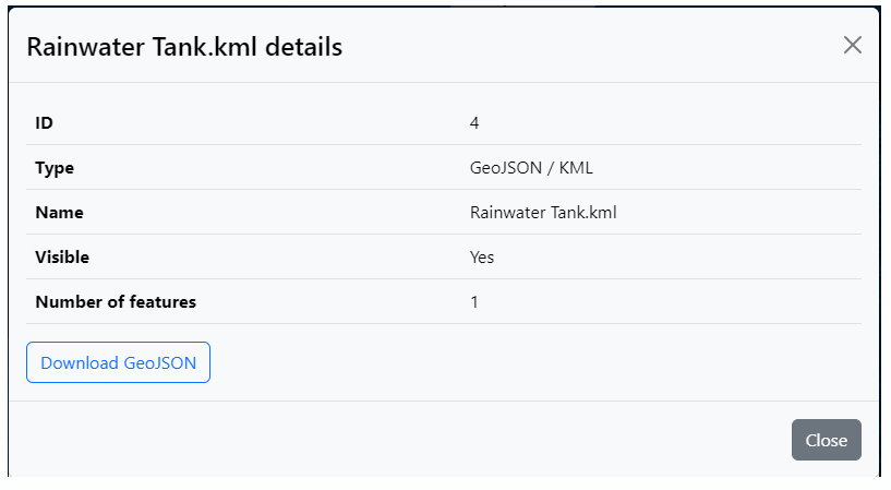 The Details view for GeoJSON / KML type layers offers preview of metadata and allows for file downloads.