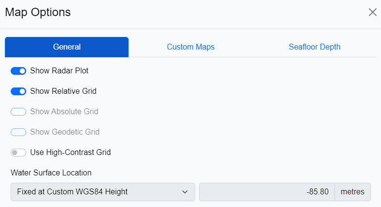 • Water Surface Location - Specifies the water surface level. This can be set to 0 m WGS84 height, custom WGS84 height or determined by a depth sensor input.