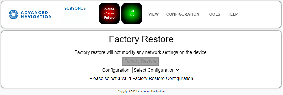 - Navigate to Tools → Factory Restore. From the Select Configuration drop-down menu, select the appropriate configuration for the: