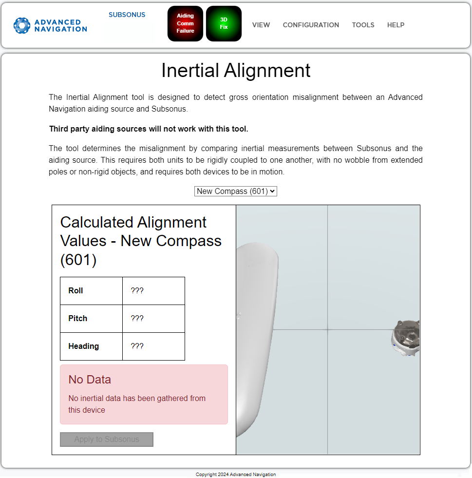 The Inertial Alignment tool is to detect gross orientation misalignment between Subsonus and an Advanced Navigation aiding source. The tool uses the networked aiding source (such as GNSS Compass or Certus) to track motion of the vessel and determine the relative alignment.